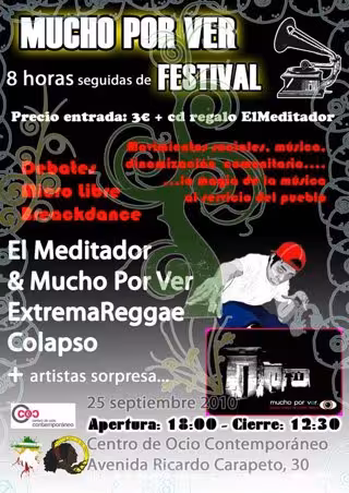 Finalmente, de la mano del MC ElMeditador comenzará el show místico, fonético y libertario con la intervención del grupo musical de acción directa MuchoPorVer. Una conjunción de reggae, bossanova, blues, rumba y funk pondrán fin a una jornada mágica.