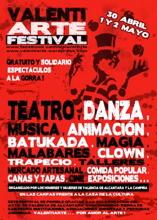 La localidad cacereña de Valencia de Alcántara volverá a llenarse de arte callejero, de música, teatro, color, animación, circo y danza de la mano de artistas locales, nacionales y de la vecina Portugal, en la cuarta edición del Valentiarte, que se celebrará desde este miércoles, día 30 de abril, al viernes, día 2 de mayo.
