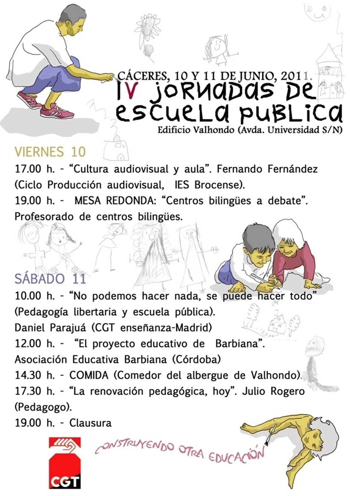 El sindicato CGT organizará en Cáceres los días 10 y 11 de este mes de junio las IV Jornadas de Escuela Pública, en el Edificio Valhondo (Antigua Facultad de Filosofía).