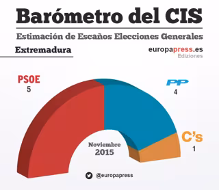 La macroencuesta del Centro de Investigaciones Sociológicas (CIS) para las elecciones generales del 20 de diciembre da la victoria al PSOE en Extremadura, que obtendría 5 escaños de los 10 se reparten en la comunidad, seguido del PP, que sacaría 4 diputados, y Ciudadanos obtendría uno.