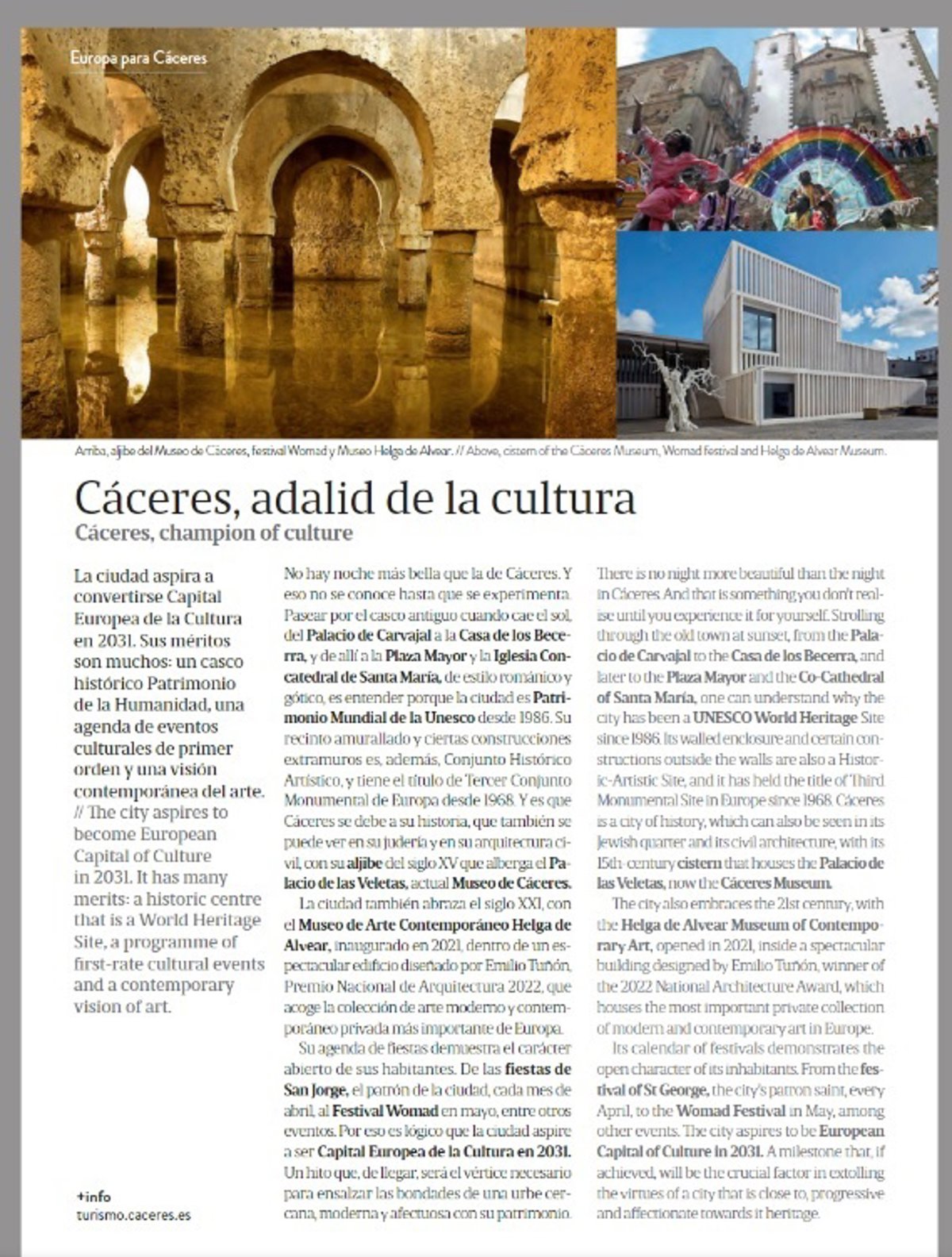 En Air Europa ya se puede leer un reportaje durante este mes de abril titulado 'Cáceres, adalid de la cultura'. Está redactado tanto en español como en inglés, destacando la "agenda de eventos culturales de primer orden y una visión contemporánea del arte" de la ciudad de Cáceres.