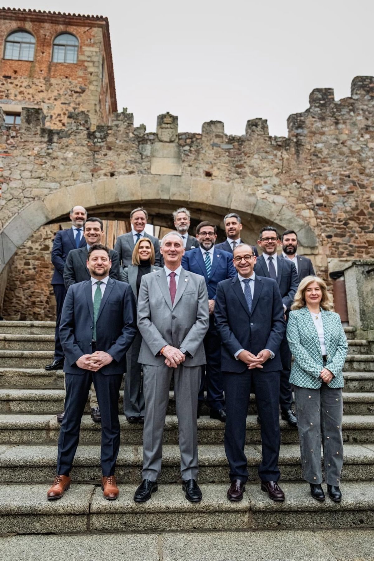 Alcaldes de municipios que componen el Grupo de Ciudades españolas de Patrimonio de la Humanidad posan con motivo de la asamblea que la organización ha celebrado en Cáceres, a 21 de marzo de 2026. - AYUNTAMIENTO DE CÁCERES