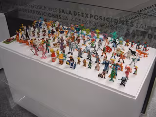 El coleccionista Pablo García del Río, de 31 años y natural de Badajoz, expone en la biblioteca pública Bartolomé J. Gallardo una colección de más de 1.000 figuras de goma y PVC de personajes de series de televisión infantiles, cómics y tebeos, incluso de películas y marcas comerciales, principalmente de los años 80 y 90.