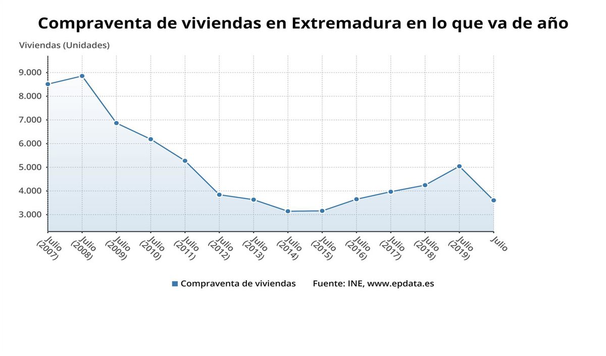 La compraventa de vivienda ha bajado un 16,9 por ciento en julio en Extremadura con respecto al mismo mes del año anterior, hasta situarse en las 634 operaciones.
