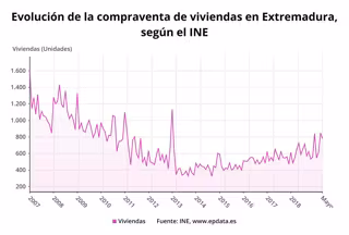 La compraventa de viviendas ha subido en Extremadura un 6,8 por ciento el pasado mes de mayo en relación al mismo mes de 2018, hasta sumar 780 operaciones, según ha informado este viernes el Instituto Nacional de Estadística (INE).