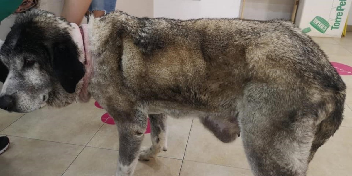 Una situación que le provocó graves heridas en el cuello y las patas, así como un estado de salud deplorable debido a la falta de atención veterinaria, y que se agravó debido a que padece leishmaniosis y un tumor no maligno de 20 centímetros de longitud.