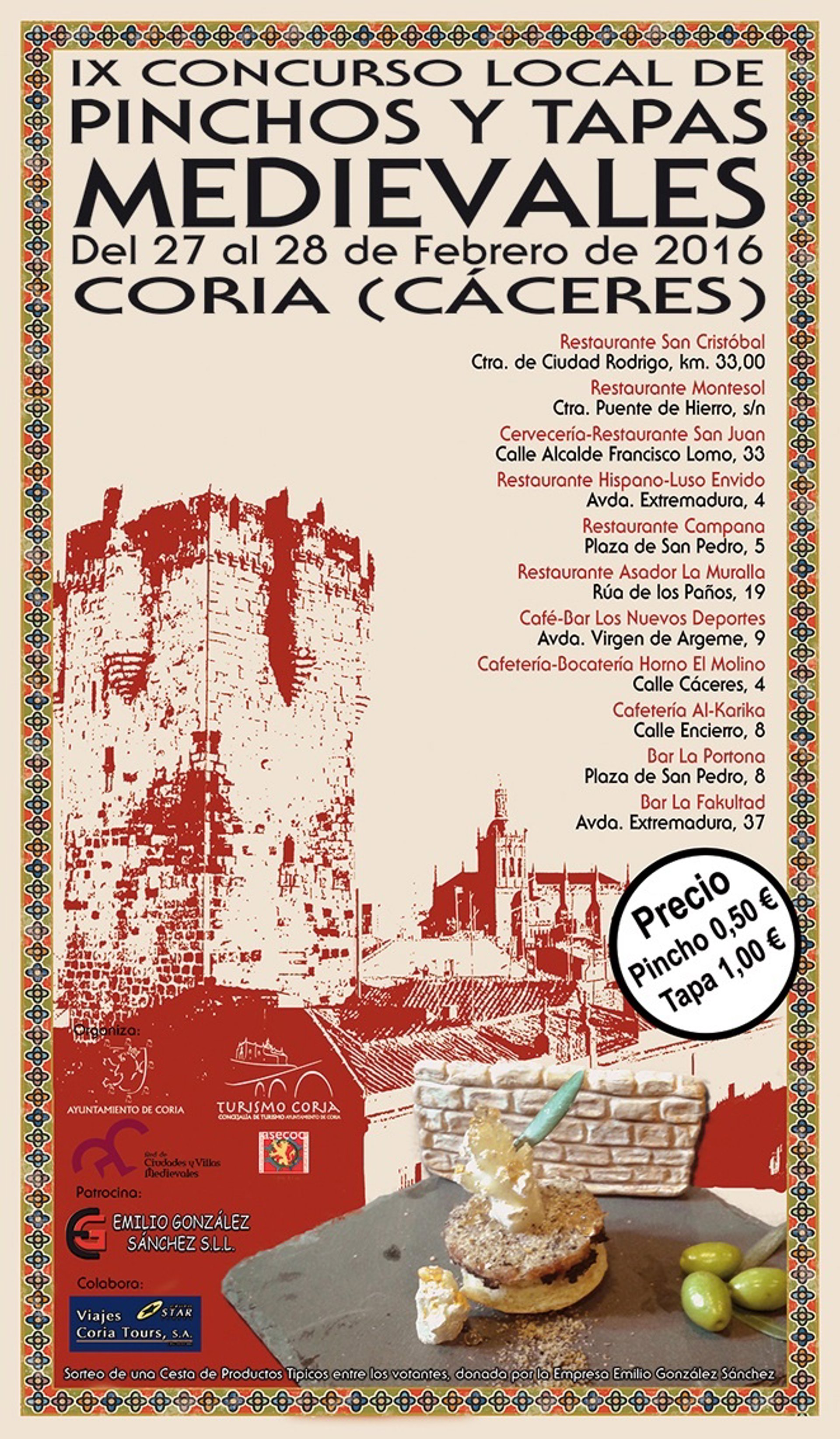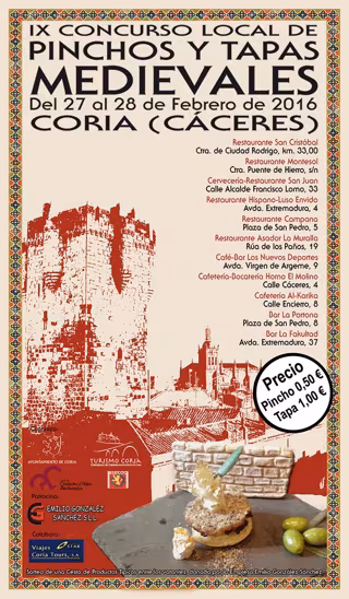 La ciudad cacereña de Coria celebra este fin de semana el IX Concurso de Pinchos y Tapas Medievales Ciudad de Coria, en el que también se elegirá al finalista que representará a la localidad cacereña en la gran final del Certamen Internacional de Pinchos y Tapas Medievales que se celebrará en el municipio de Consuegra (Toledo).