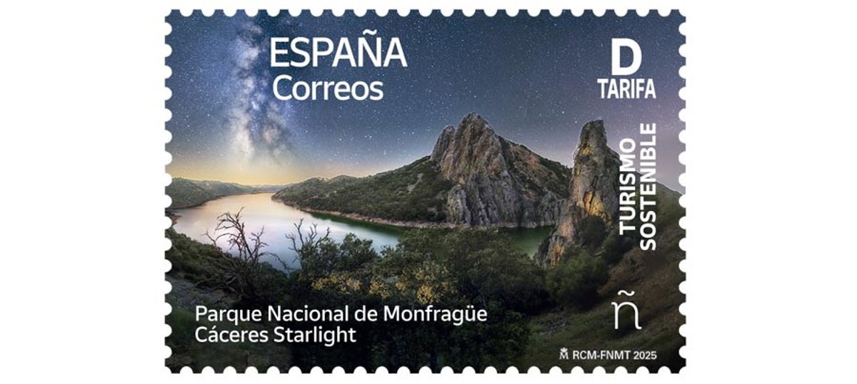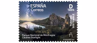 El sello tiene una tirada ilimitada, un valor postal Tarifa D (2,40 euros) y recoge una imagen del Parque Nacional de Monfragüe (Cáceres), un "buen ejemplo" de sostenibilidad y con certificación de destino turístico Starlight en 2016, señala en nota de prensa Correos.