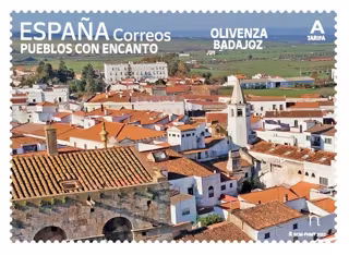 Este efecto recoge una imagen de Olivenza y forma parte de una emisión de cuatro sellos autoadhesivos de la serie 'Pueblos con Encanto' que simulan las tiras de tarjetas postales antiguas, plegadas en formato fuelle, donde el reverso del sello también está impreso como si de una postal se tratara.