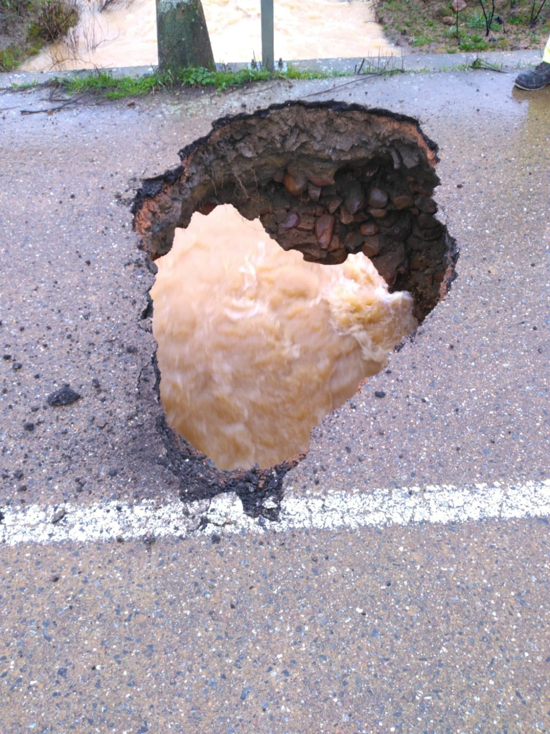 Socavón en la carretera BA-049 provocado por las lluvias. - DIPUTACIÓN DE BADAJOZ