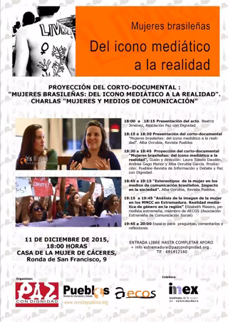 'Mujeres brasileñas: del icono mediático a la realidad' está producido por la Revista 'Pueblos' y Paz con Dignidad, y estará dirigido por Laura Daudén, Andrea Gago Menor y Alba Onrubia García. Así, la presentación correrá a cargo de Alba Onrubia, que también estará presente en el acto, según informa Asociación Extremeña de Comunicación Social en nota de prensa.