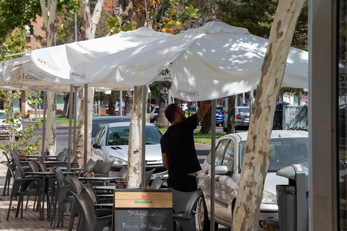 Archivo - Un hombre abre los toldos en una terraza - Andrés Rodríguez - Europa Press - Archivo