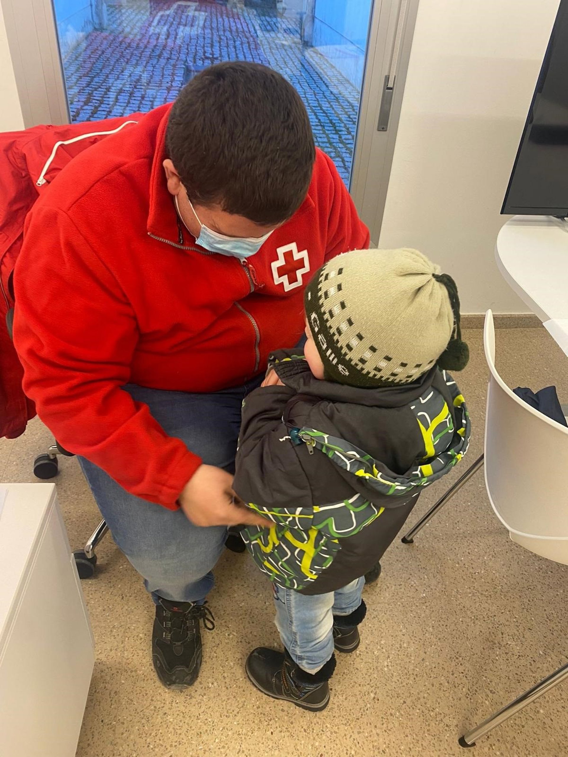 Un trabajador de Cruz Roja Extremadura atiende a un niño procedente de Ucrania. - CRUZ ROJA EXTREMADURA
