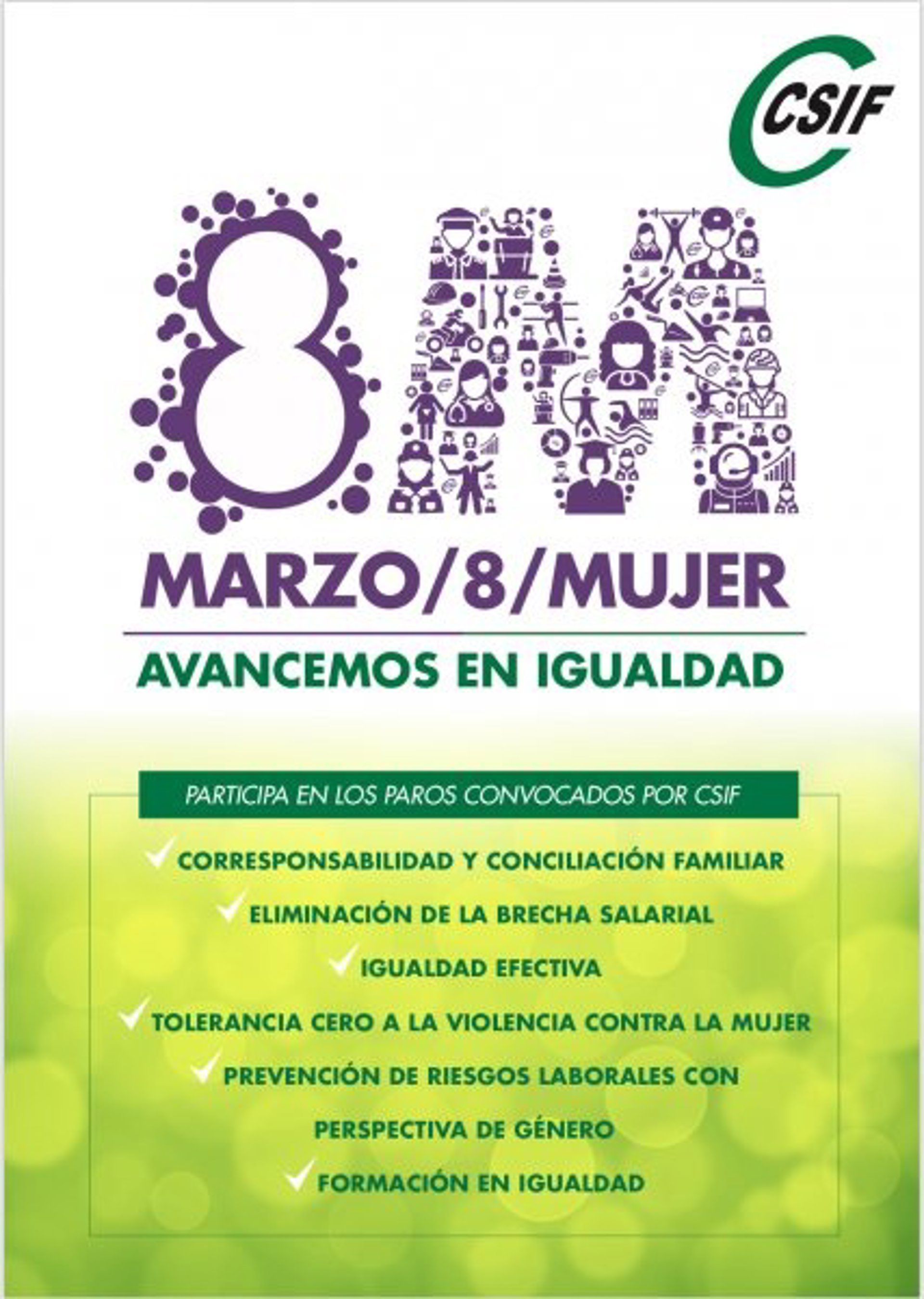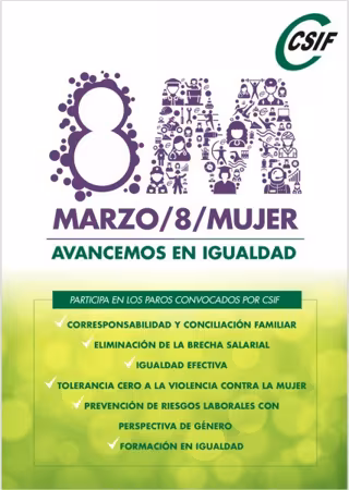 Finalmente, CSIF destaca que celebra el 8 de marzo desde los ejes de "corresponsabilidad y conciliación familiar, eliminación de la brecha salarial, igualdad efectiva, tolerancia 0 a la violencia contra la mujer", prevención laboral con perspectiva de género y la formación de los/las delegados sindicales en materia de Igualdad.