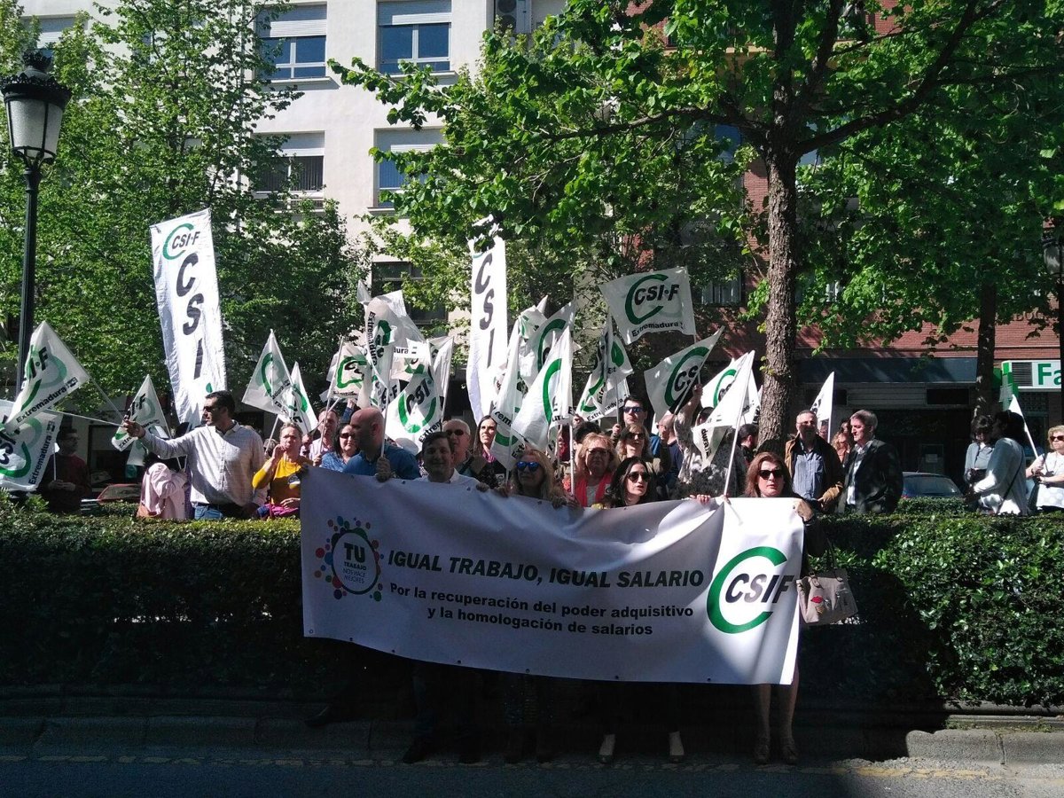Medio centenar de personas han participado este viernes ante la Subdelegación del Gobierno en Cáceres en una protesta convocada por CSIF para reivindicar la recuperación del poder adquisitivo de los empleados públicos y la equiparación salarial de los trabajadores de la Administración General del Estado con los de las comunidades autónomas.