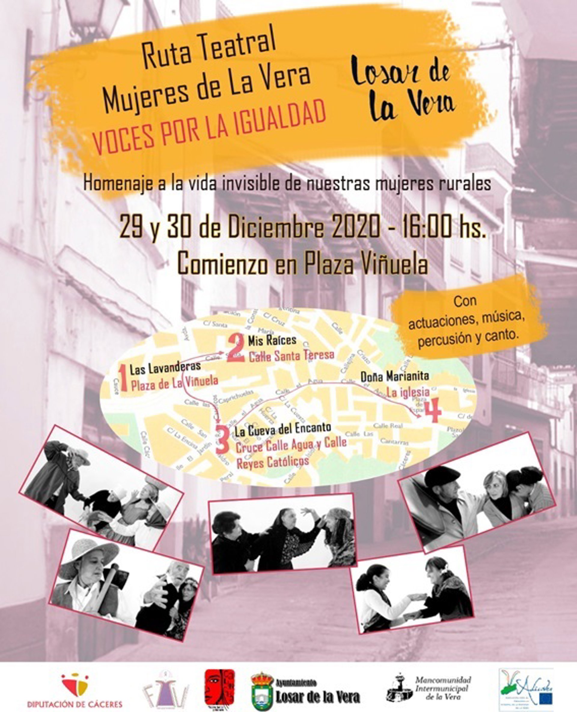La Ruta Teatral Mujeres de la Vera es resultado del Proyecto de Igualdad Voces por la Igualdad II, subvencionado por la Diputación de Cáceres y ejecutado por la Federación de Asociaciones de Mujeres de la Vera en colaboración con la Asociación Amas de Casa Cristo del Humilladero y con la Asociación Calincha Teatro Social y Género.