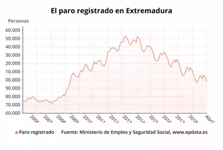 El número de parados registrados en las oficinas de los servicios públicos de empleo (antiguo Inem) en Extremadura ha bajado un 3,81 por ciento en abril respecto al mes anterior, con 3.878 parados menos, lo que deja el número total de desempleados en la región en 97.905 personas, según ha informado este lunes el Ministerio de Trabajo, Migraciones y Seguridad Social.