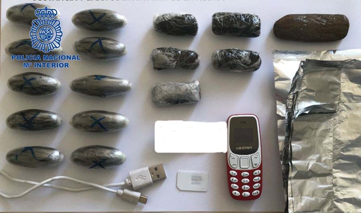 Posteriormente ella misma reconoció que en su organismo portaba 10 "bellotas" de hachís, una placa de polen de hachís, un teléfono móvil y un cargador, y entre su ropa interior, en una compresa, escondía cinco "bellotas" más de hachís, y por lo cual fue detenida, informa en nota de prensa la Policía Nacional.