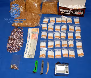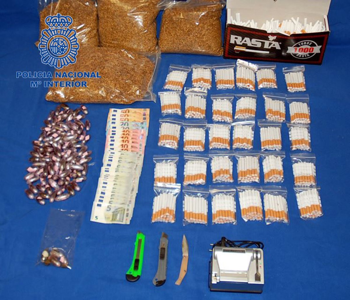 Finalmente, la tarde del pasado día 23 de mayo se llevaron a cabo dos registros domiciliarios en la calle Miguel Hernández y en la calle Guadajira, durante los cuales fueron intervenidos 1.100 gramos de "bellotas" de hachís, 4.300 gramos del comúnmente denominado tabaco de contrabando, 370 euros en billetes fraccionados, así como numerosos útiles para la preparación y envasado del tabaco.