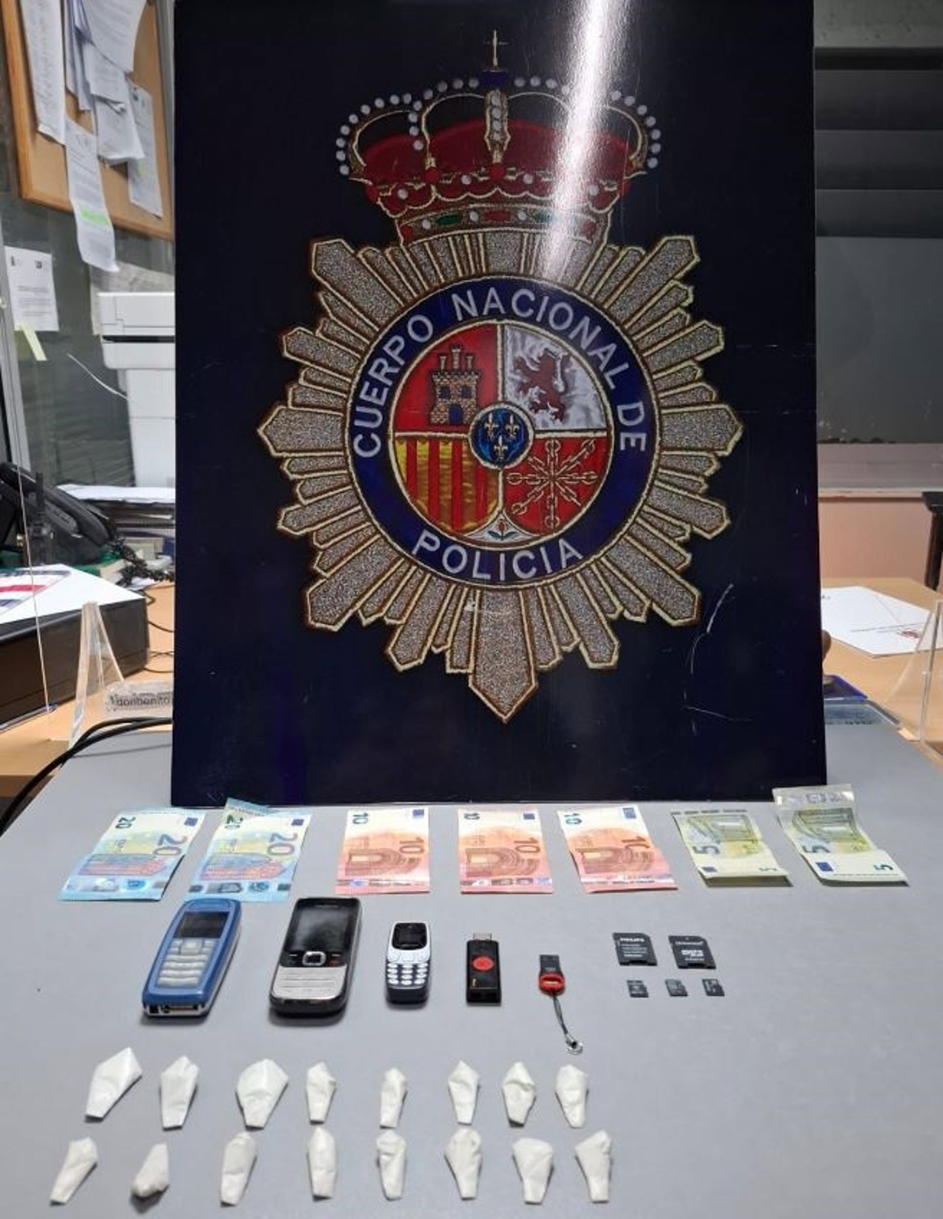 Entre sus pertenencias localizaron 16 papelinas de cocaína, además de dinero en efectivo y tres teléfonos móviles, por lo que se procedió a su inmediata detención, ha informado la Policía Nacional en nota de prensa.