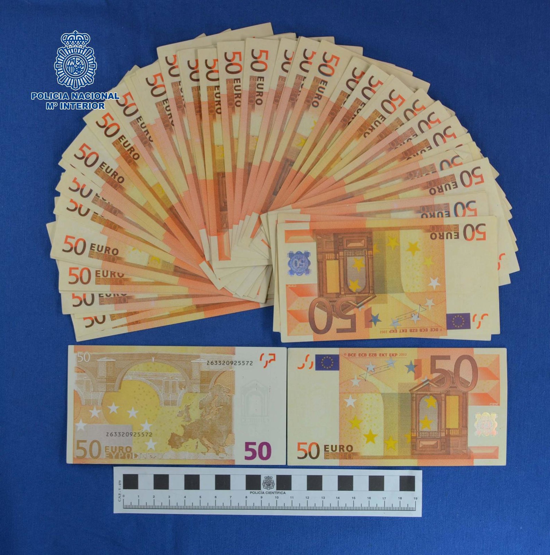 Ya en dependencias policiales, los agentes inspeccionaron el equipaje que portaba y hallaron en el interior de un monedero 3.150 euros divididos en 63 billetes de 50 euros que resultaron ser falsos, imputándole así, además de un delito de atentado contra agente de la autoridad, un delito de falsificación de moneda.