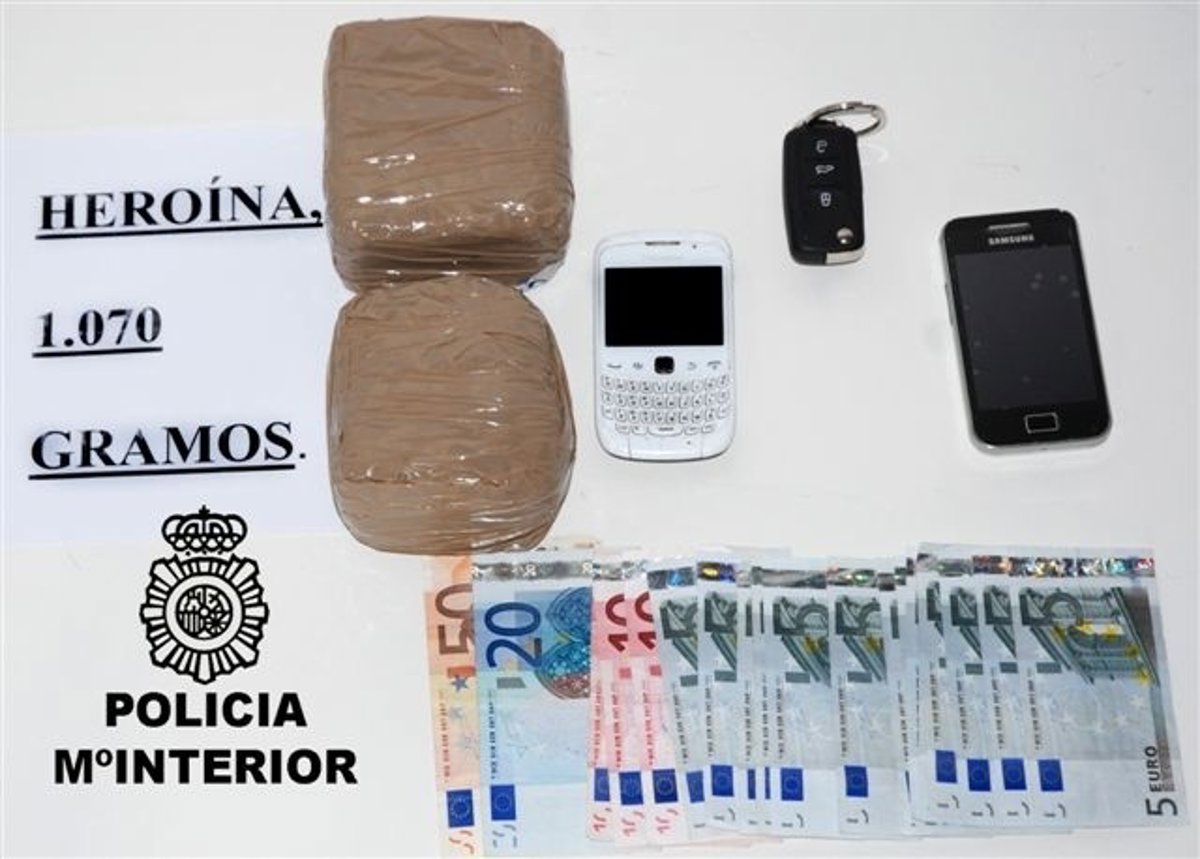 La policía encontró 1.070 gramos de esta sustancia estupefaciente y por ello detuvo de forma "inmediata" al conductor, al que también le fueron decomisados 180 euros y dos teléfonos móviles. Esta cantidad de droga, ha señalado la Policía Nacional, serviría para conseguir 26.018 dosis dispuestas para la venta en el mercado ilícito.