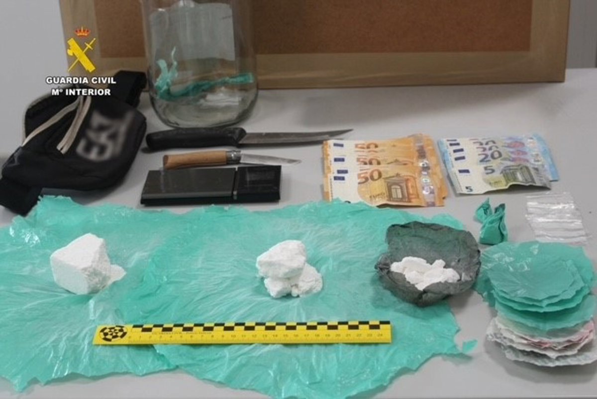 Los agentes incautaron 2.775 dosis de cocaína presentada en formato roca, además de dos envoltorios dosificados con 6 gramos de la misma sustancia, una báscula de precisión, numerosos plásticos preparados para la confección de dosis, un cuchillo de grandes dimensiones y 585 euros en efectivo, supuestamente procedentes del tráfico de drogas, según informa la Guardia Civil en nota de prensa.