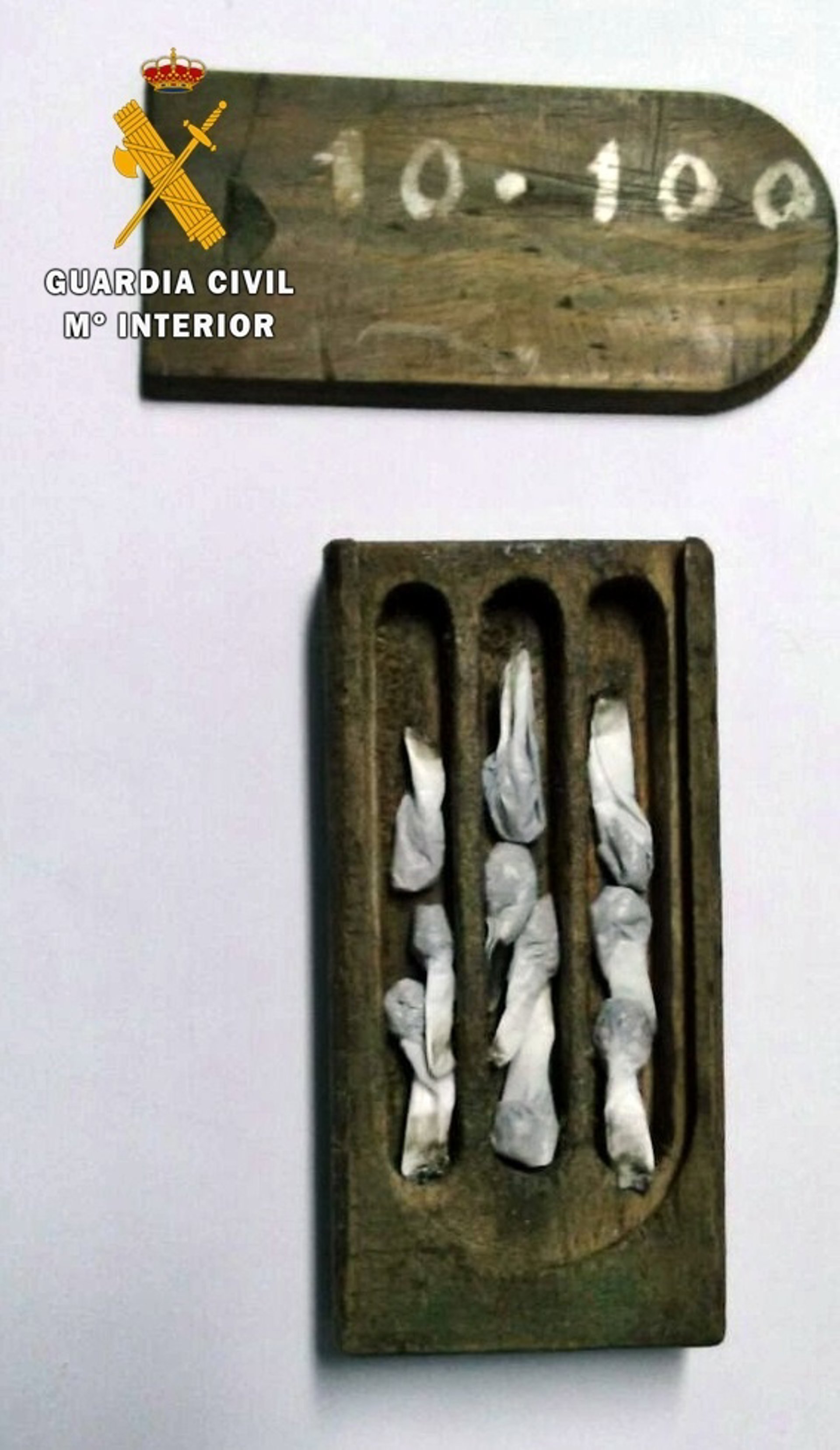 Tras identificación y registro minucioso del turismo, los agentes hallaron oculta en una caja del habitáculo de la palanca de cambio 10 papelinas de cocaína-heroína preparadas para su venta y 175 euros presuntamente obtenidos del trafico de la droga.