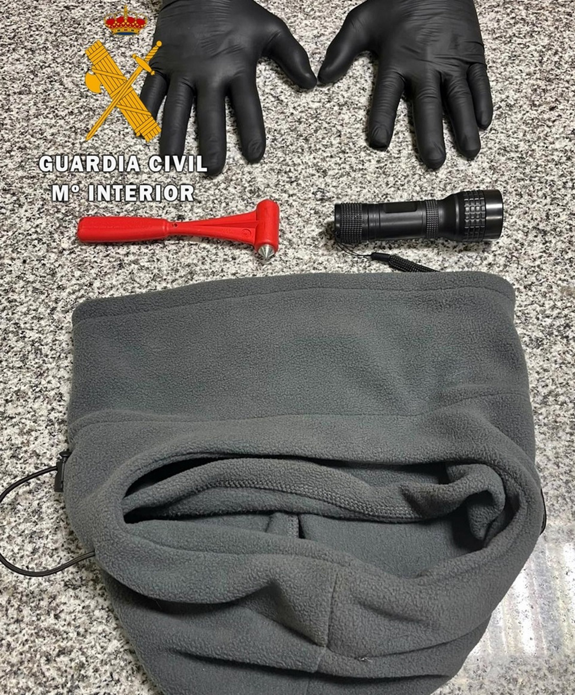 Dentro de los dispositivos de servicios marcados en la vigilancia del sospechoso, el pasado 19 de enero se le interceptó y detuvo cuando portaba un martillo, una linterna, guantes y un pasamontañas con los que supuestamente se desplazaba para perpetrar otros robos similares.