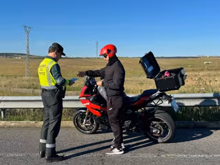 La Guardia Civil de Tráfico informa a un motorista sobre las normas de circulación por carretera - DGT