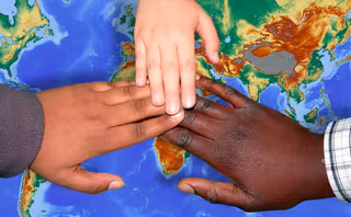 Manos de personas de diferentes razas se unen sobre un mapa. - DIPUTACIÓN DE BADAJOZ