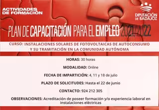 La Diputación de Badajoz va a iniciar una acción formativa en 'Instalaciones solares fotovoltaicas de autoconsumo y su tramitación en la Comunidad Autónoma de Extremadura'.