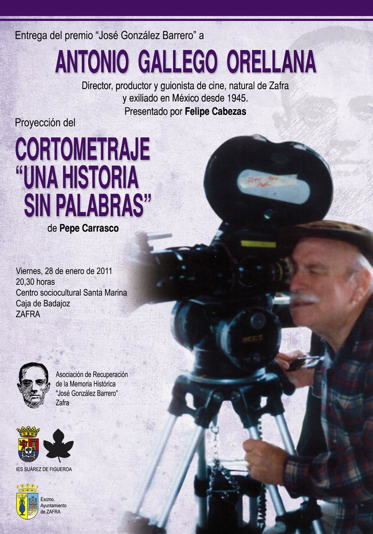 La Asociación para la Recuperación de la Memoria Histórica 'José González Barrero' de Zafra (Badajoz) entregará el premio 'José González Barrero', en su edición de 2010, este viernes, día 28, al director, guionista y productor cinematográfico Antonio Gallego Orellana, natural de Zafra.