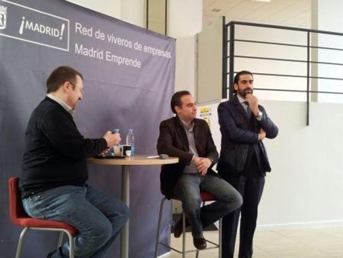 El director general de Inversiones y Acción Exterior, Enrique Barrasa, ha participado en el Coffee Break organizado por Madrid Emprende en uno de sus viveros de empresas, acompañando al director de operaciones del grupo de empresas Intexmedia, Javier Alonso.