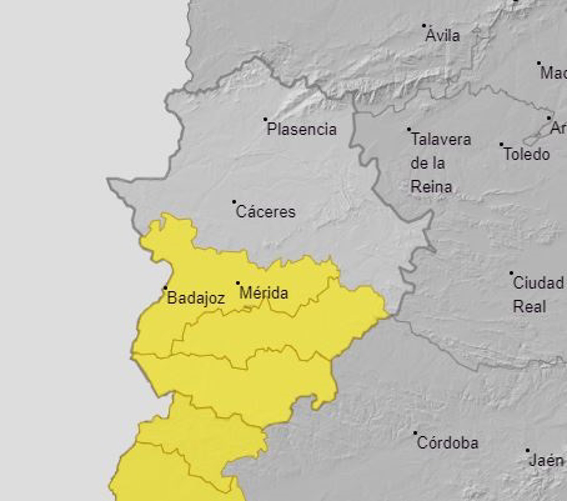 En concreto, el aviso amarillo afectará a las comarcas de las Vegas del Guadiana, la de Barros y La Serena y al sur de la provincia de Badajoz, según los datos de la Agencia Estatal de Meteorología y recoge Europa Press.