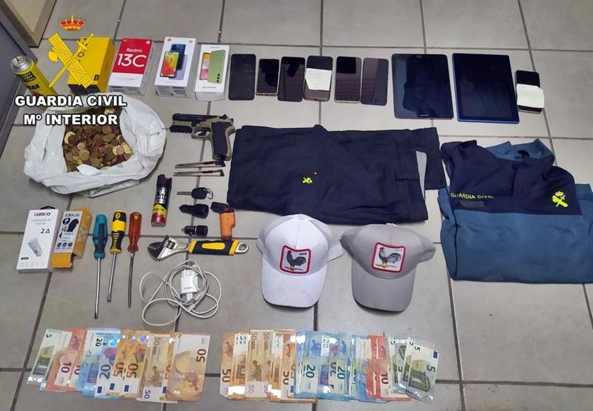 En la inspección del turismo, se hallaron los objetos y el dinero sustraído en los comercios, además de una pistola simulada, un spray de defensa personal y un uniforme de la Guardia Civil. Con la identificación de los dos detenidos, ambos con un "amplio historial delictivo", constataron que el conductor carecía de permiso de conducción habilitado, siendo sometido a las pruebas de detección de alcohol y drogas legalmente establecidas, arrojando un resultado positivo por consumo de sustancias estupefacientes, pendiente de confirmación por el Laboratorio de referencia de la Dirección General de Tráfico.