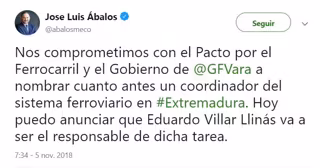 "Nos comprometimos con el Pacto por el Ferrocarril y el Gobierno de Vara a nombrar cuanto antes un coordinador del sistema ferroviario en Extremadura. Hoy puedo anunciar que Eduardo Villar Llinás va a ser el responsable de dicha tarea", señala el ministro de Fomento en su tuit.
