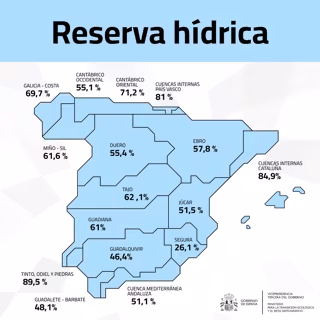Los embalses que están por encima del 50 por ciento de su capacidad son el Cantábrico Oriental (71,2 por ciento), el Cantábrico Occidental (55,1 por ciento), el Miño-Sil (61,6 por ciento), Galicia Costa (69,7 por ciento), las cuencas internas del País Vasco (81 por ciento), el Duero (55,4 por ciento), el Tajo (62,1 por ciento), el Guadiana (61 por ciento), el Tinto, Odiel y Piedras (89,5 por ciento), la Cuenca Mediterránea Andaluza (51,1 por ciento), el Júcar (51,5 por ciento), el Ebro (57,8 por ciento), y las Cuencas internas de Cataluña (84,9 por ciento).