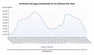 Gráfico de la evolución del agua embalsada en España en los dos últimos años - EPDATA