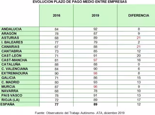 Sin embargo, las empresas afincadas en Canarias y Asturias son las que más han incrementado los periodos medios de pago en los últimos tres años, pasando de 68 a 89 días en el caso de Asturias y de 67 a 88 las canarias.