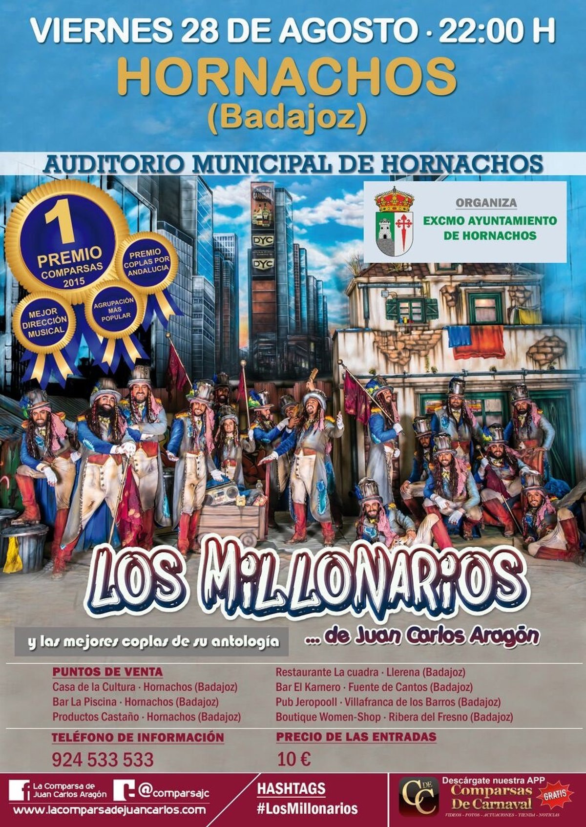 El Auditorio Municipal de Hornachos (Badajoz) albergará este viernes, día 28, a las 22,00 horas, la actuación "Los Millonarios y las mejores coplas de su antología" del carnavalero Juan Carlos Aragón.