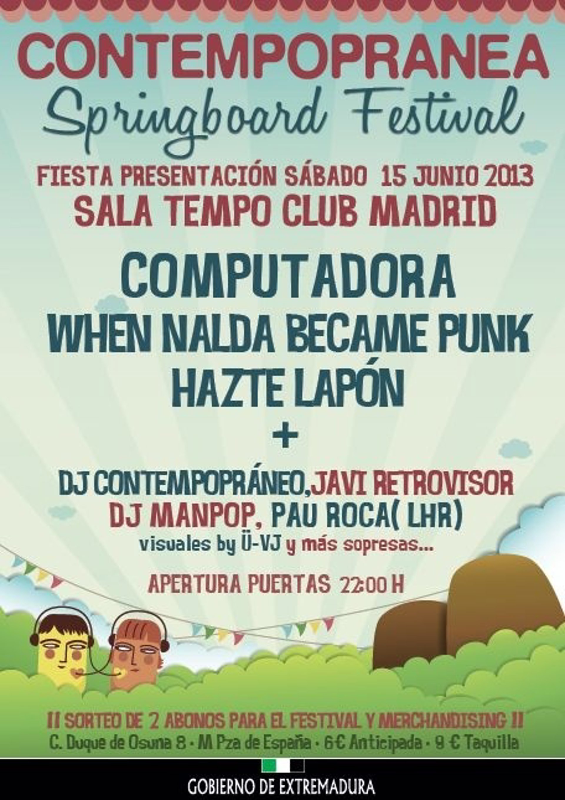 El espíritu del festival extremeño de la escena indie 'Contempopránea' llegará este sábado, día 15, a Madrid bajo el nombre de 'Contempopránea Springboard Festival', título que engloba a las distintas fiestas de presentación de este certamen que se desarrollan por todo el país.