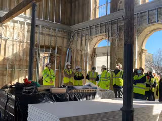 En el vestíbulo se ha ejecutado la solera y en el cuerpo sur se ha levantado y colocado el tejado y pueden verse las cerchas originales del edificio, que se mantienen para preservar la identidad del mismo.