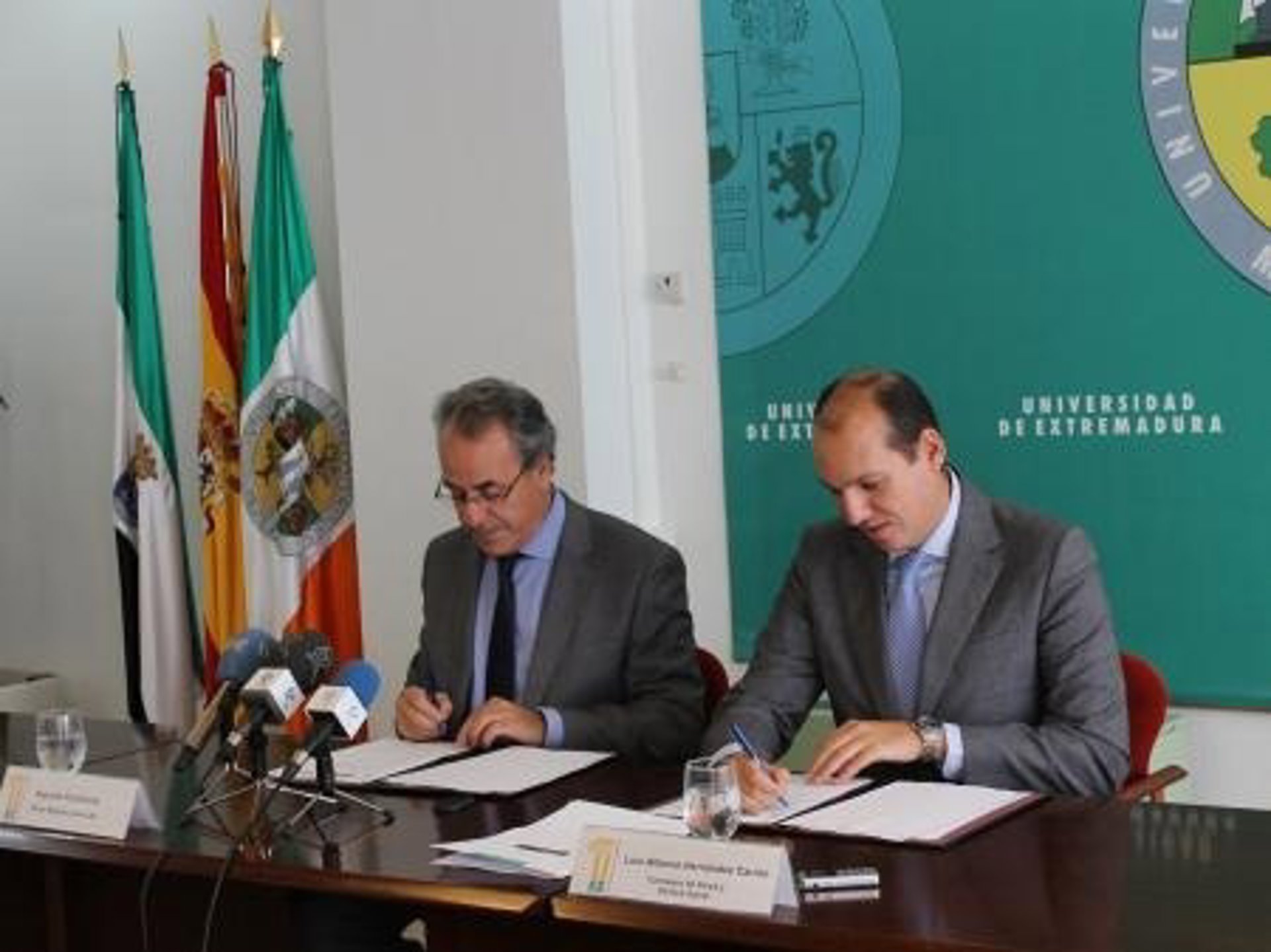 El consejero de Salud y Política Social, Luis Alfonso Hernández Carrón, y el rector de la Universidad de Extremadura, Segundo Píriz, han firmado un convenio de cooperación educativa por el que, por primera vez, los estudiantes de esta institución podrán realizar sus prácticas académicas en las oficinas del Consorcio Extremeño de Información al Consumidor.