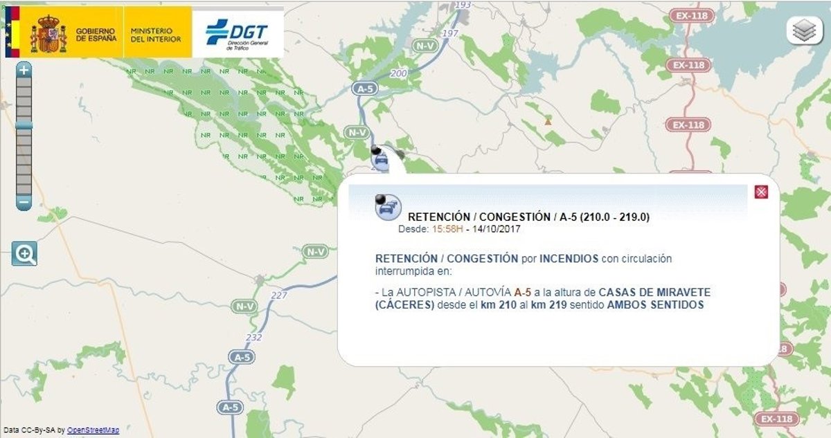El incendio del autobús se ha producido pasadas las 15,00 horas de este sábado, y ha obligado al corte de la Autovía A-5 entre los kilómetros 210 y 219 en ambos sentidos durante tres horas, tras las que el tráfico ha quedado restablecido, según los datos aportados por la Dirección General de Tráfico (DGT).