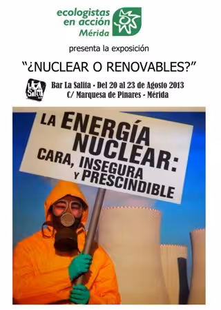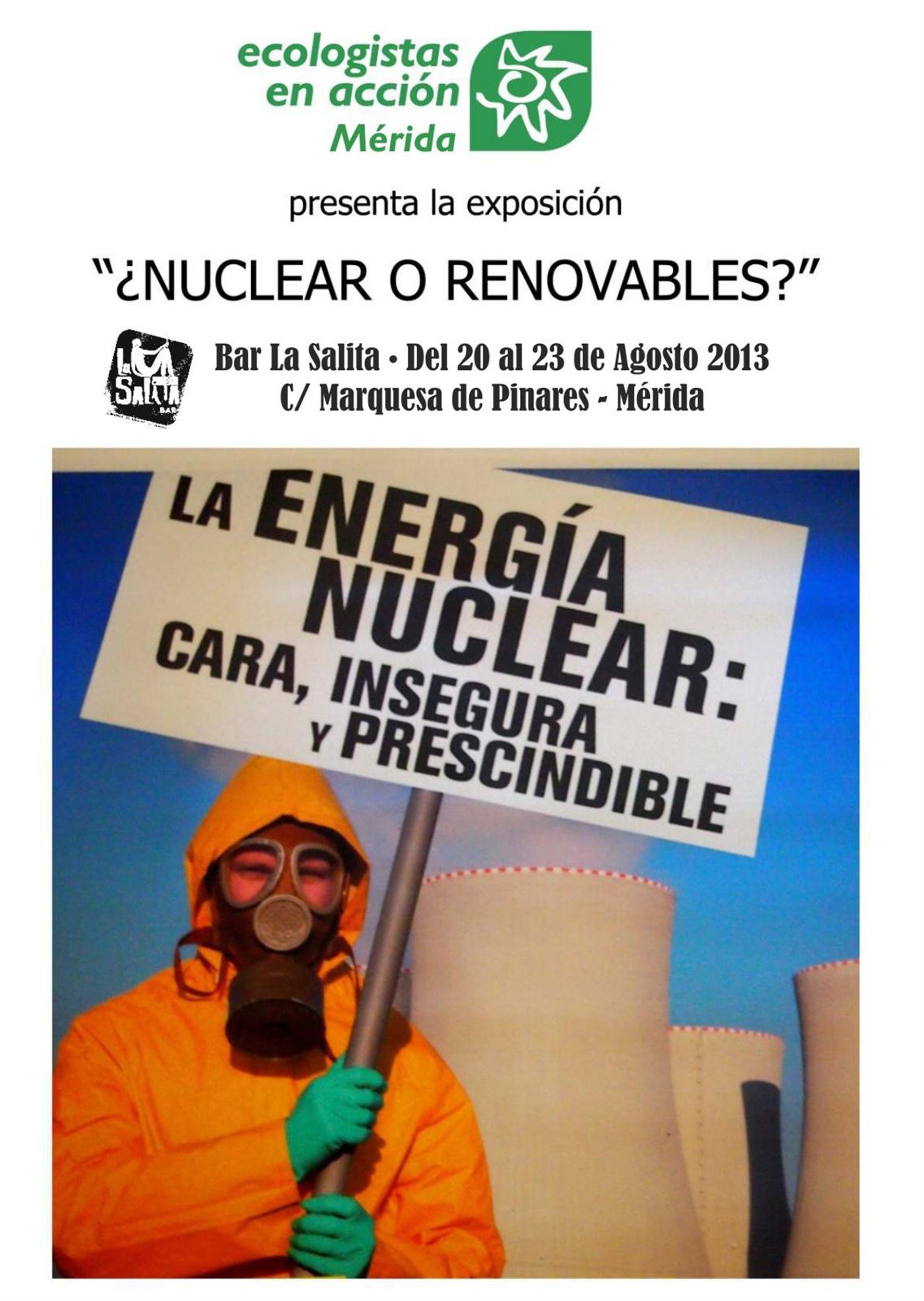 El colectivo Ecologistas en Acción Mérida presentará este martes, día 20, a las 21,00 horas en el Bar La Salita (C/ Marquesa de Pinares esquina Calle Muza) de la capital extremeña, la exposición itinerante titulada "¿Nuclear o Renovables?".