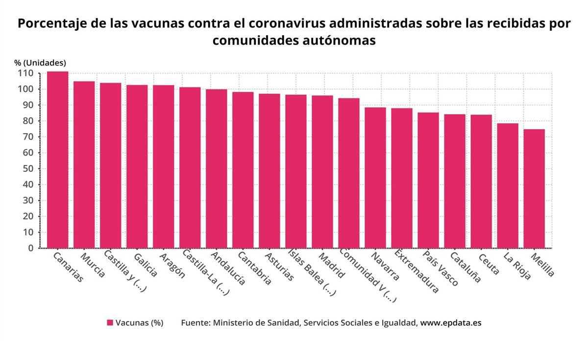 Porcentaje de las vacunas contra el coronavirus administradas sobre las recibidas por comunidades autónomas - EPDATA