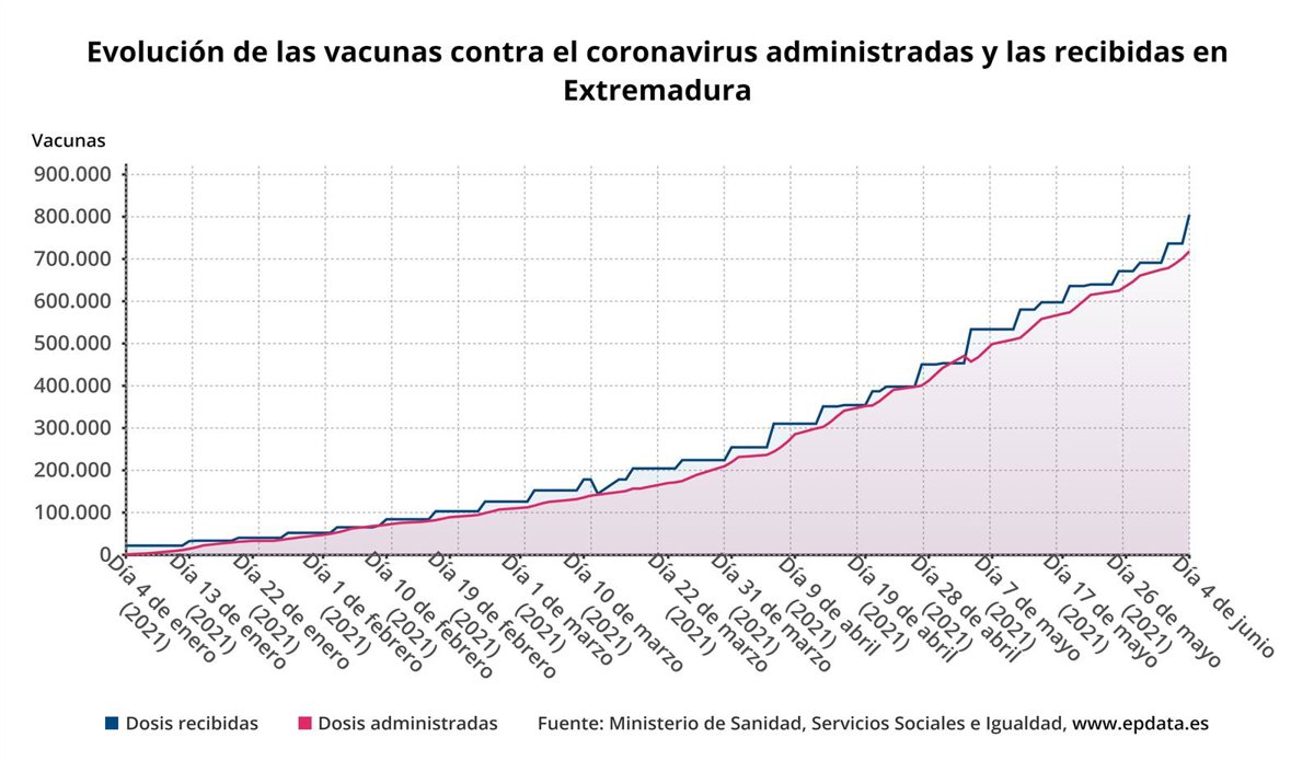 Evolución de las vacunas contra el coronavirus administradas y recibidas en Extremadura - EPDATA