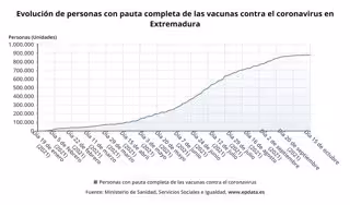 Un total de 885.140 extremeños, que suponen el 92,8 por ciento de la población de la región a vacunar, cuentan ya con la pauta completa de la vacuna contra la Covid-19, mientras que 97.034 extremeños cuentan con una dosis adicional, que se está administrando a personas con condición de alto riesgo, que viven en residencias y mayores de 70 años.