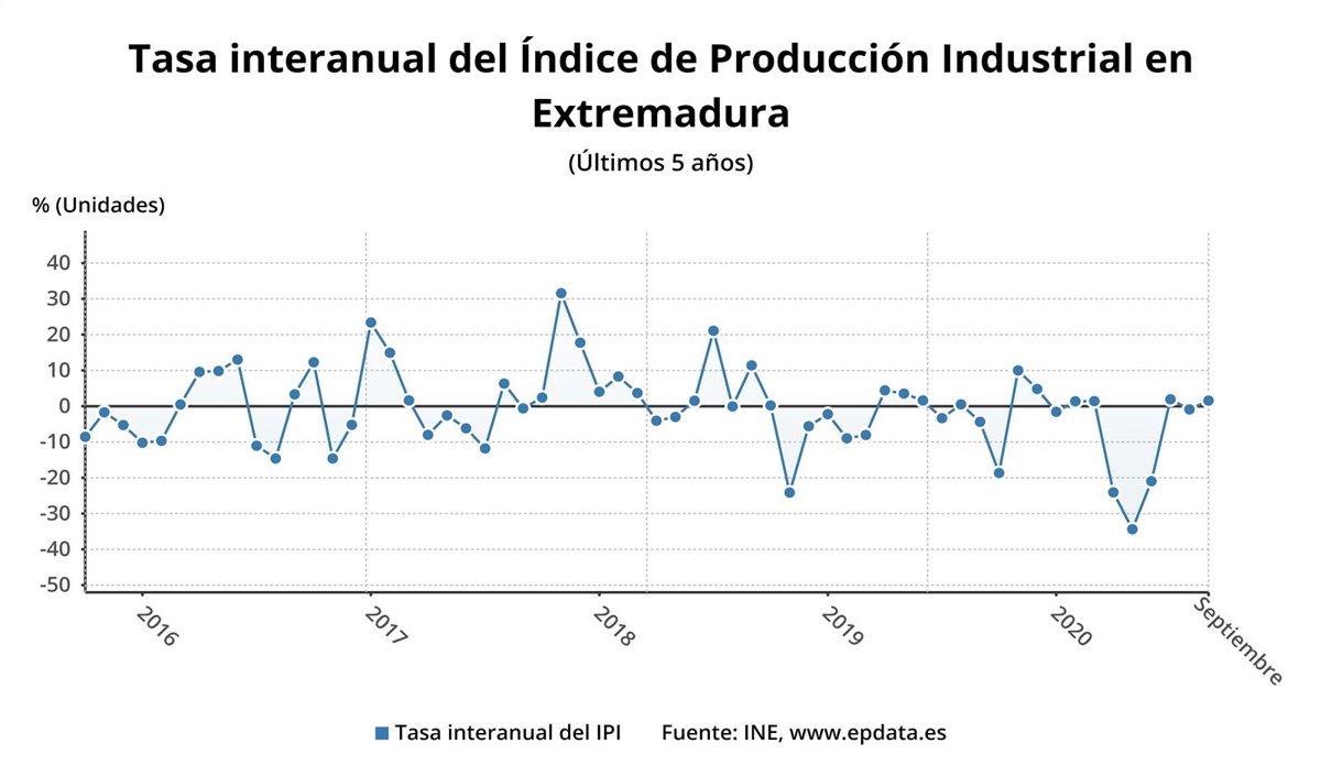 La producción industrial en Extremadura ha subido un 1,6 por ciento en septiembre en comparación con el mismo mes de 2019, el quinto mayor incremento por comunidades frente al descenso del -0,6% en el conjunto del país, según ha informado hoy el Instituto Nacional de Estadística (INE).